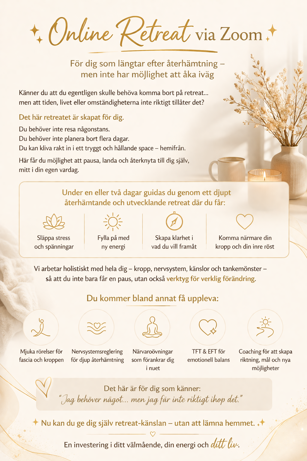 Välkommen till dagar där du får möjlighet att stanna upp, fylla på med energi och skapa nya möjligheter i ditt liv.